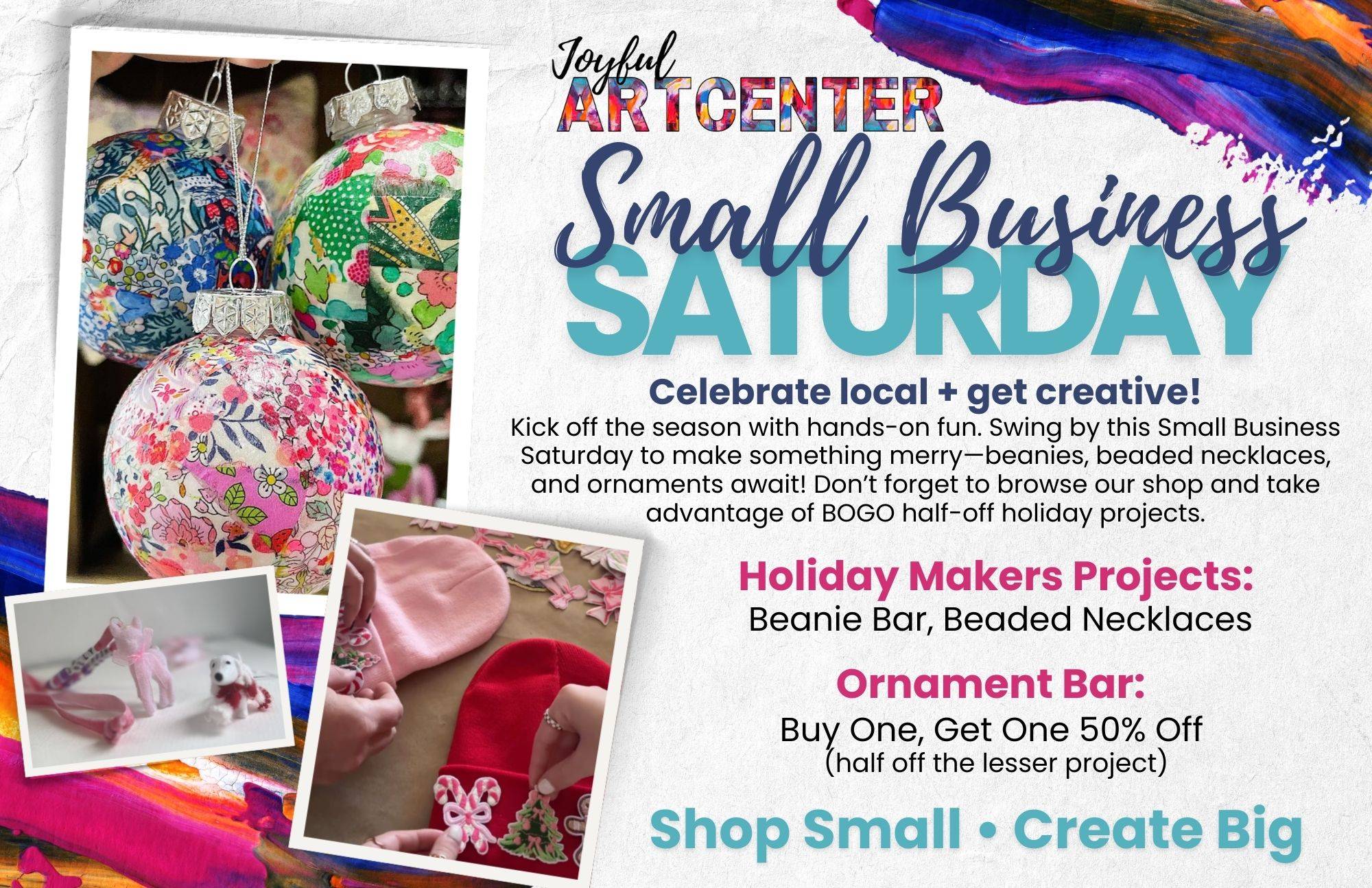 Join us on Small Business Saturday! Celebrate local + get creative! November 29 • 10:30am - 3:00pm Kick off the season with hands-on fun. Swing by this Small Business Saturday to make something merry—beanies, beaded necklaces, and ornaments await! Don’t forget to browse our shop and take advantage of BOGO half-off holiday projects. Holiday Makers Projects: Beanie Bar, Beaded Necklaces Ornament Bar: Buy One, Get One 50% Off (half off the lesser project) Plan Ahead for Winter Break! Seats are...