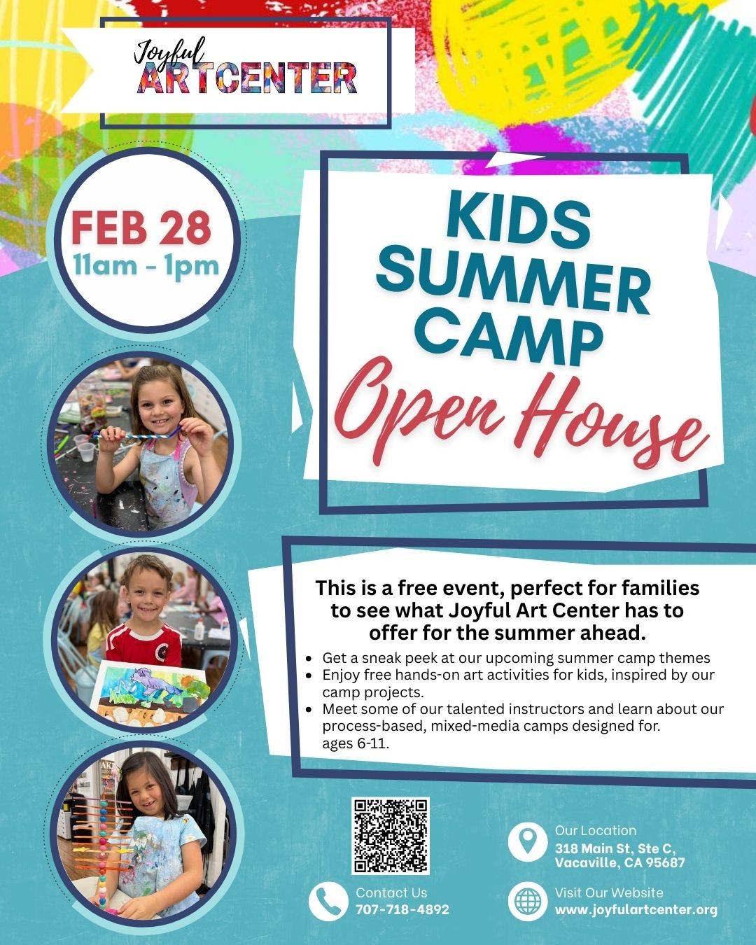 Hi Joyful Families Summer Camp 2026 is almost here — and we’re kicking it off with a fun, creative Open House tomorrow! February 28, 202611:00 AM – 1:00 PMJoyful Art Center Join us as we introduce our exciting Summer 2026 Camps and Programs! What to Expect: A sneak peek at our upcoming camp themes Free hands-on art activities inspired by camp projects Meet our talented instructors Learn about our process-based, mixed-media camps for ages 6–11 This is a free event — perfect for families to...